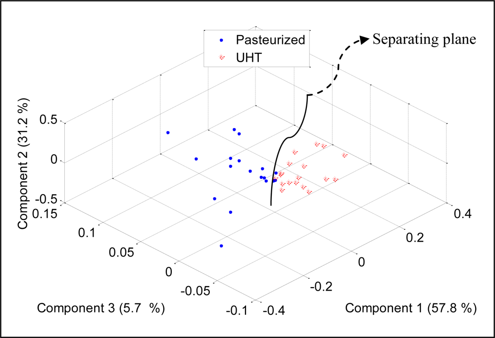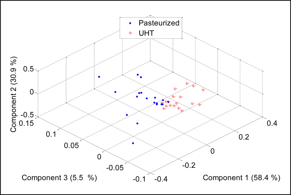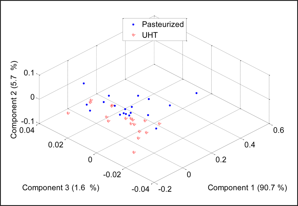 To check the discriminative ability of the developed E-nose to separate between two different milk heat treatments (UHT, pasteurization), the PCA was performed and the results were projected on three most important principal components, which covered 94.7% of data variation. Figure 12 shows the score plot of the data.