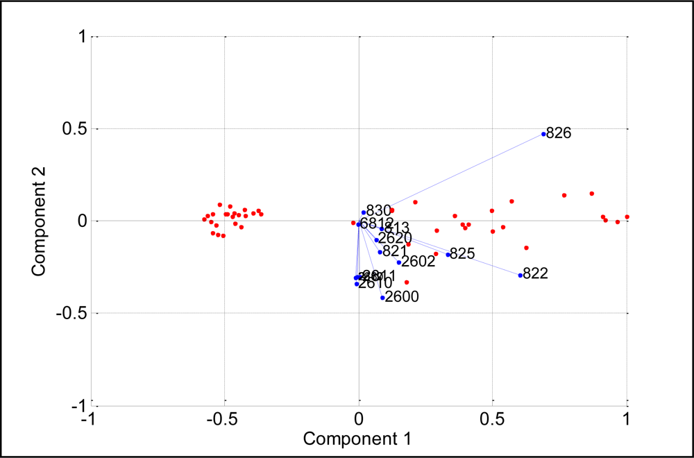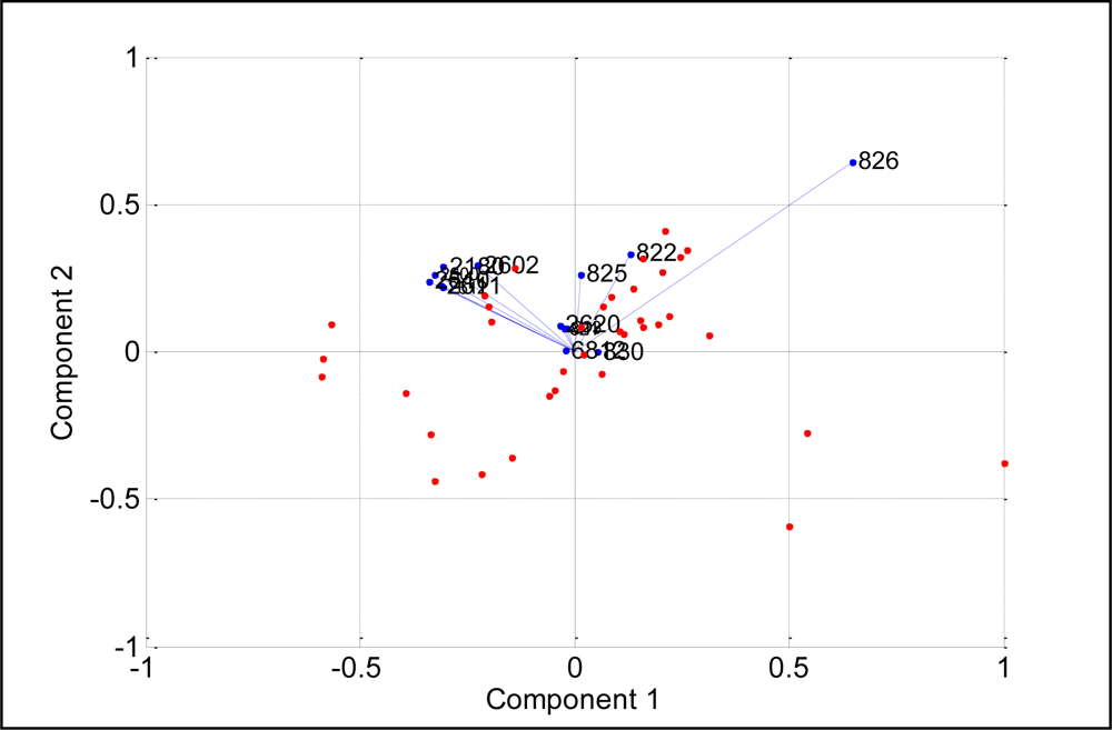 It can be noticed that the measurements appear together although the pasteurized milks were scattered on the left side of the separating line while the UHT ones were scattered on the right side of the separating line. This observation shows that the developed E-nose was able to produce different patterns for different milk heat treatments. Again, the loading values of sensors TGS826, TGS822, TGS825, TGS2602, TGS2180, TGS2600, TGS2610, TGS2612, TGS2611 and TGS2620 provide a significant contribution to the discrimination of pasteurized and UHT milks, respectively, as shown in Figure 13.