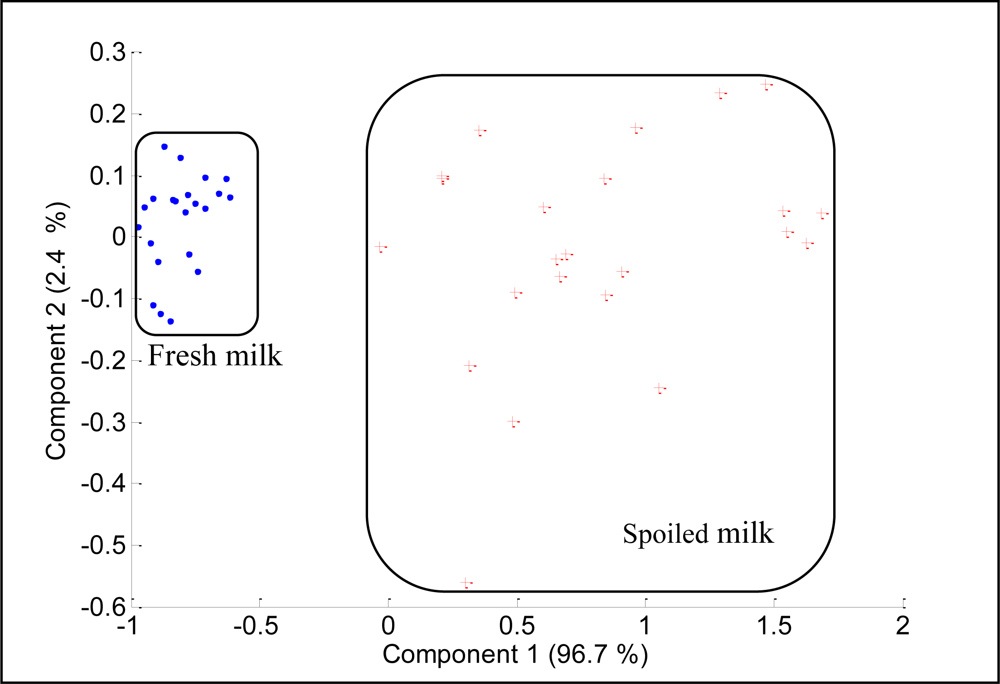 The PCA of the fresh and spoiled milks generated the results shown in Figure 14. The two most important principal components, PC1 and PC2, covered 99.1% of data variation. The score plot shows that fresh milk data appear together and are distant from the spoiled milk data, which are scattered over a wider area.