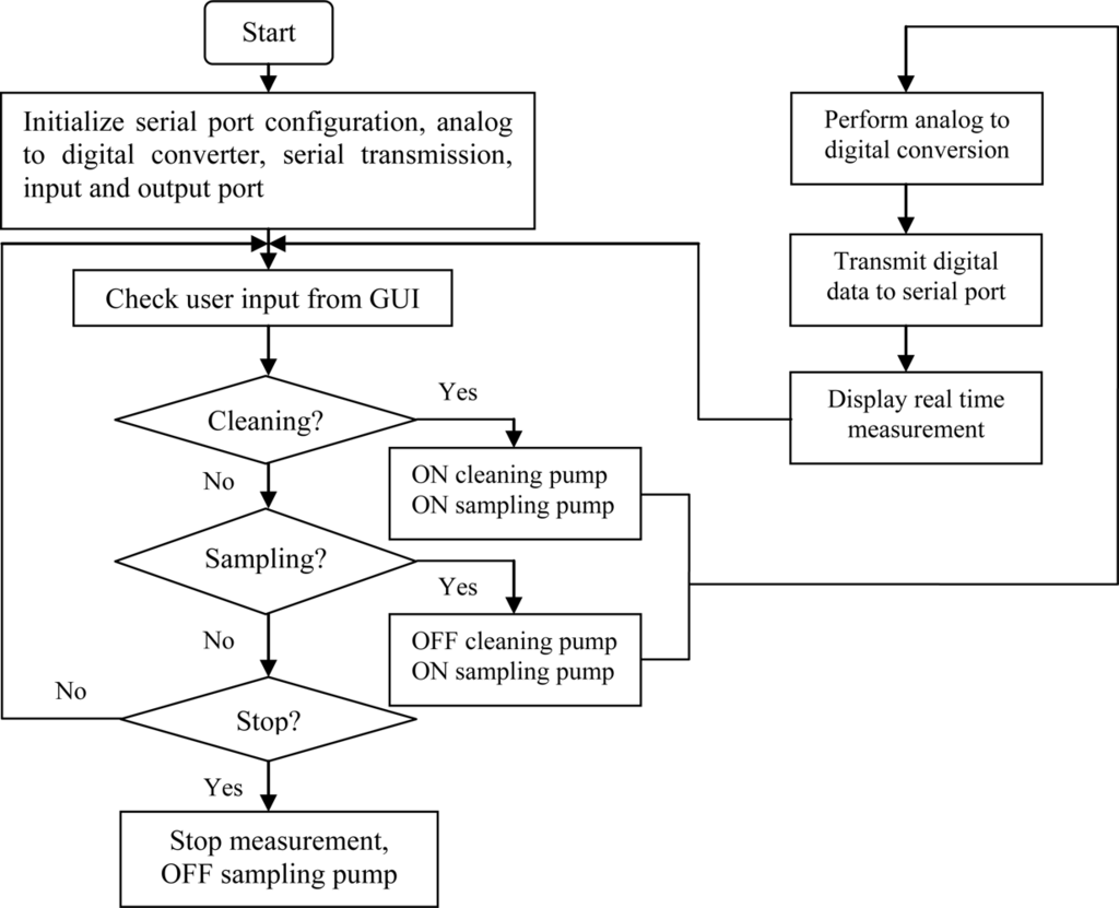 The data acquisition and controller (DAC) unit consists of AD708JN amplifiers, DG406DJ analog multiplexer, PIC16F877A microcontroller and MAX232 for serial interfacing. Voltage output from sensor is connected to the AD708JN operational amplifier. The gain of the operational amplifier was determined on a one to one basis, depending on the strength of each sensor’s response. The amplified voltage signals of the 14 sensors were connected to the DG406DJ analog multiplexer and the output of the analog multiplexer was connected to channel 0 of the PIC16F877A microcontroller. A program to read, perform analog to digital conversion, receive and transmit data was written in assembly language (MPLAB IDE, version 7.20) and embedded into the PIC16F877A microcontroller. Figure 5 shows the block diagram of the DAC and Figure 6 shows the flowchart of the program embedded into the microcontroller.