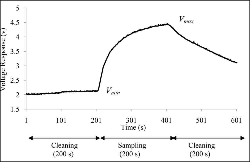 Figure 7 shows a voltage response obtained by the TGS822 from the measurement of orange juice. From the voltage response, the average voltage value at 380 s to 400 s (Vmax) and the average voltage value at 180 s to 200 s (Vmin) were computed. From these values, the relative response of the sensor given by Vr = (Vmax − Vmin)/Vmin was calculated. The Vr values obtained from 14 sensors were called features and were used in the analysis to investigate the repeatability, reproducibility and discriminative ability of the developed E-nose.