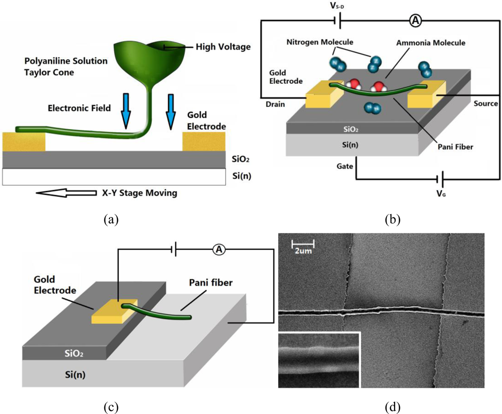 A single polyaniline nanofiber field effect transistor (FET) gas sensor fabricated by means of electrospinning was investigated to understand its sensing mechanisms and optimize its performance. We studied the morphology, field effect characteristics and gas sensitivity of conductive nanofibers. The fibers showed Schottky and Ohmic contacts based on different electrode materials. Higher applied gate voltage contributes to an increase in gas sensitivity. The nanofiber transistor showed a 7% reversible resistance change to 1 ppm NH3 with 10 V gate voltage. The FET characteristics of the sensor when exposed to different gas concentrations indicate that adsorption of NH3 molecules reduces the carrier mobility in the polyaniline nanofiber. As such, nanofiber-based sensors could be promising for environmental and industrial applications.1. Introduction