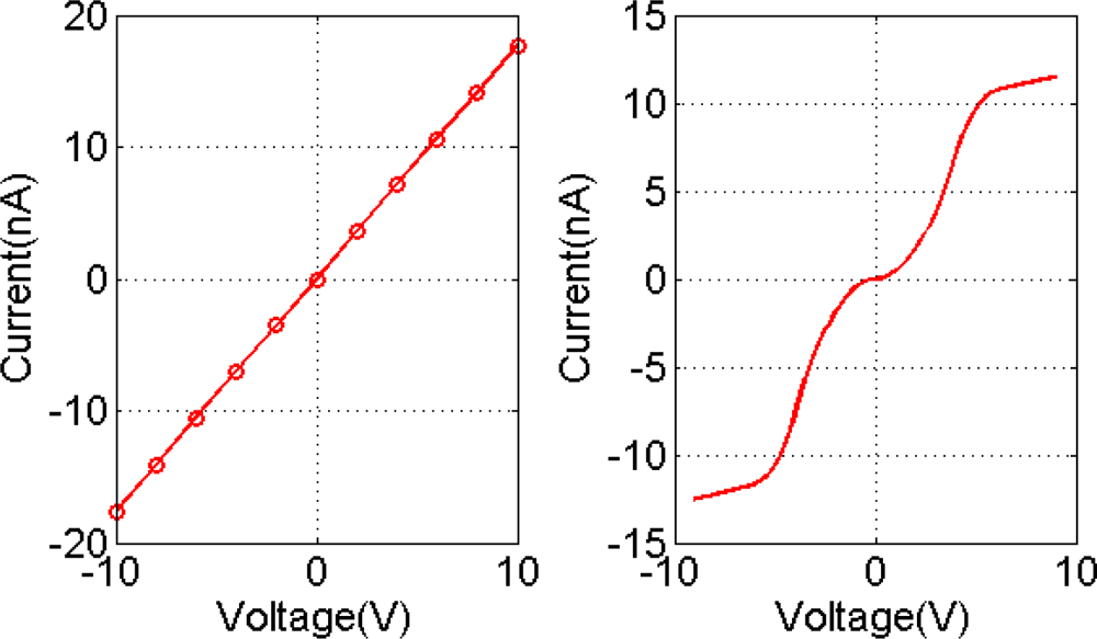 Figure 2 shows the corresponding I-V curve for two devices. A linear response of device A confirms that the polymer contact with the gold electrodes is Ohmic. When the positive terminal of voltage supply was connected to the doped silicon terminal for device B, the forward biased diode response confirms the formation of Schottky barriers at the polymer and n-doped silicon contact. Device A is used to study the gas absorbance influence on the field effect of conductive polymer channel.