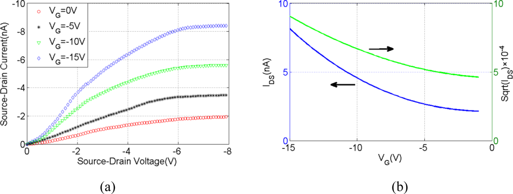 Figure 3(a) shows the output characteristics of the device under different gate voltages (VG). The source current (IS-D) curve demonstrates saturation at drain voltage (VS-D) < −6 V and the magnitude of the saturation current was controlled via the application of VG. IS-D increases with increasing VG demonstrates that the device operates as a FET, and also that the majority carriers are holes, as expected for doped polyaniline [20].