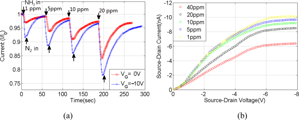 A constant 5 V potential was applied on the source and drain electrodes for the real-time monitoring of the Pani fiber’s response to NH3. The time-dependent current responses of the Pani fiber upon exposure to different concentrations of NH3 gas in a nitrogen environment are shown in Figure 4(a). Under 0 V gate voltage, the sensor’s working current decreased 2.7% when exposed to 1 ppm NH3 gas flow. In contrast, a much greater current decrease of 7% for 1ppm NH3 is obtained under VG = −10 V. After pump nitrogen into chamber, the sensor recovers to more than 90% of original resistance in minutes. Device With −10 V gate voltage also showed greater current decrease when it was exposed to 5, 10 and 20 ppm NH3. The current noise level during test is below 0.1 nA. Considering the noise to signal ratio, the limit of detection is below 0.5 ppm NH3.