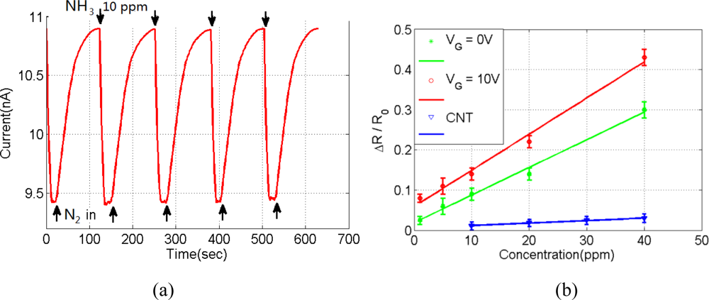 Devices have been cycled up to five times and good resistance reversibility can be observed from Figure 5(a). Each cycle was carried out in 10 ppm NH3 and nitrogen after saturation occurs in the presence of either gas. The extracted sensitivities, S = ΔR/R0, of the Pani nanofiber under two gate voltages and CNT sensor are shown in Figure 5(b). Each data point in the plot is collected by five repeated measurements for the error estimation. Sensitivity improved when the gate potential was increased from 0 V to −10 V, as can be seen from Figure 5. This improvement indicates that the single Pani fiber sensor offers tunable sensitivity with field effect. This test result is compared to our previous work on CNT dielectrophoresis deposition. Sensitivity is improved while current consumption decreased from the milliampere level to microamperes [16]. Decreased working current made the sensor suitable for applications in portable devices and the FET structure will enhance the signal-to-noise ratio when the working current is too low.