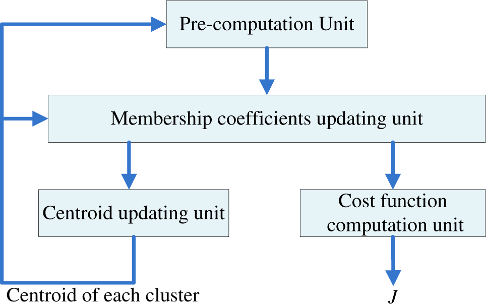 The pre-computation unit is used for reducing the computational complexity of the membership coefficients calculation. Observe that ui,k in Equation (2) can be rewritten as