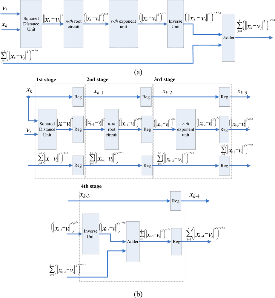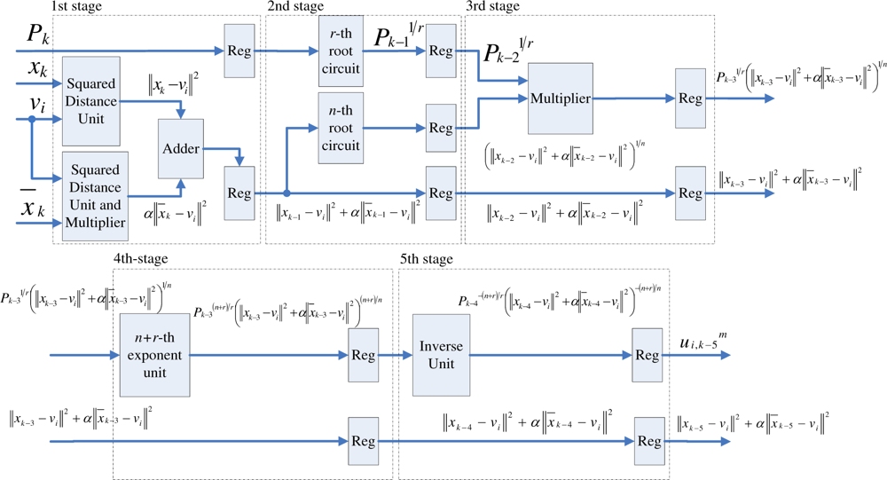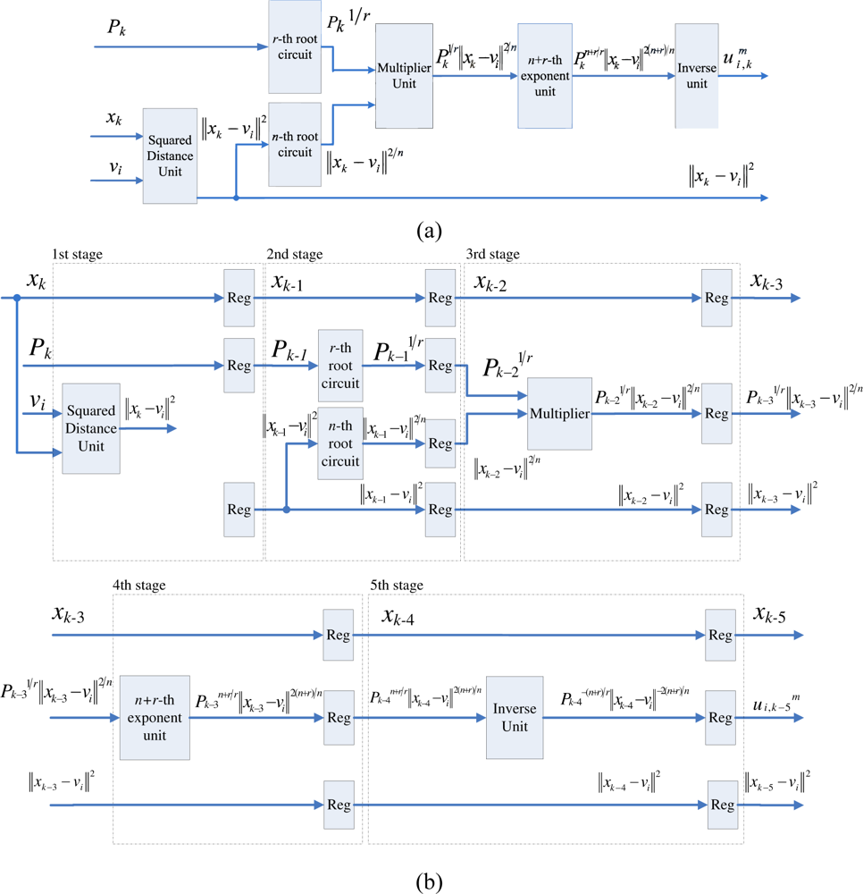 The basic circuit for computing is shown in Figure 5(a). Based on Equation (20), it follows that the circuit contains squared distance unit, r-th root and n-th root circuits, (n + r)-th power circuit, and inverse unit. From the figure, we observe that ||xk − vi||2 is first computed. This is accomplished by the squared distance unit. Following that, the r-th root circuit and n-th root circuit are used for computing and (||xk − vi||2)1/n, respectively. The (n + r)-th power circuit is then adopted for computing . Finally, the inverse unit is employed for evaluating . Similar to the pre-computation unit, the basic circuit for computing can also be implemented in a pipeline fashion. An example of 5-stage pipeline implementation is shown in Figure 5(b).