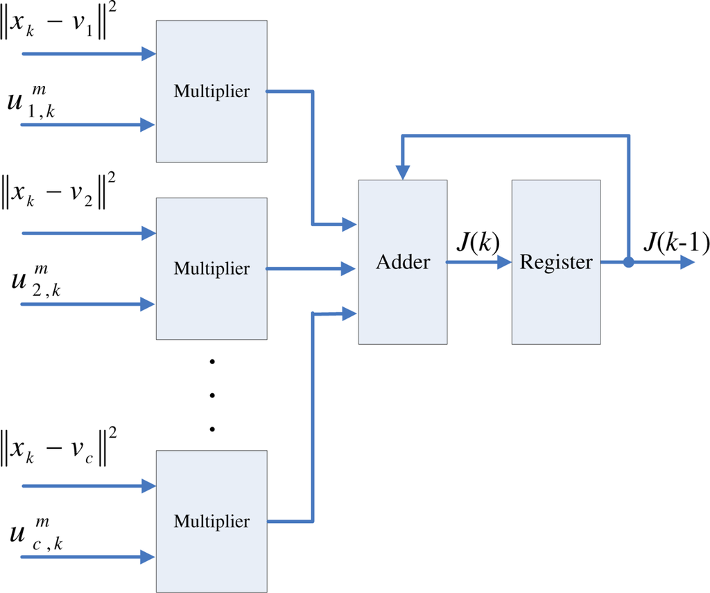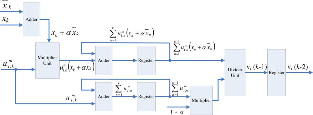 Figures 10–12 depict the architecture for membership coefficients updating, centroids updating and cost function computation for FCM-S based on Equations (9), (11) and (23), respectively. Similar to the original FCM algorithm, the proposed FCM-S architecture computes the centroids and cost function incrementally. In the FCM-S, the incremental centroid for the i-th cluster up to data point xk is defined as