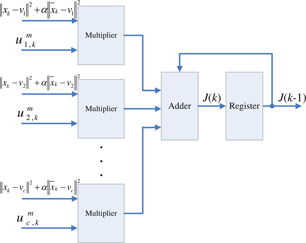 We can view the membership coefficients, centroids and cost function for FCM-S as the extension of those for original FCM by replacing ||xk − vj||2 with ||xk − vj||2 + α||x̄k − vj||2. Therefore, the membership coefficients updating unit, centroids updating unit and cost function computation unit for FCM-S also have similar architectures to those of their counterparts in original FCM. The circuits in FCM-S require only additional squared distance unit and adder for computing ||xk − vj||2 + α||x̄k − vj||2.