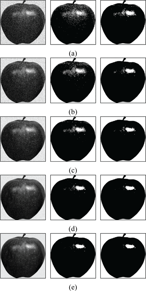 From the Table 1, we see that FCM-S has lower segmentation error rate as compared with the original FCM. In addition, their gap in the error rate increases as the noise becomes larger. The FCM-S is able to attain lower segmentation error rate because the spatial information is used during the training process. However, in the original FCM, the spatial information is not used. Figures 14 and 15 show the segmentation results of the images “Apple” and “Strawberry” for various b values. Table 2 and Figure 16 show the segmentation error rate and segmentation results of FCM-S for the image “Pear & Cup”, respectively. The image contains three classes (i.e., c = 3). We can see from Table 2 and Figure 16 that the FCM-S performs well for the noisy images with more than two classes.
