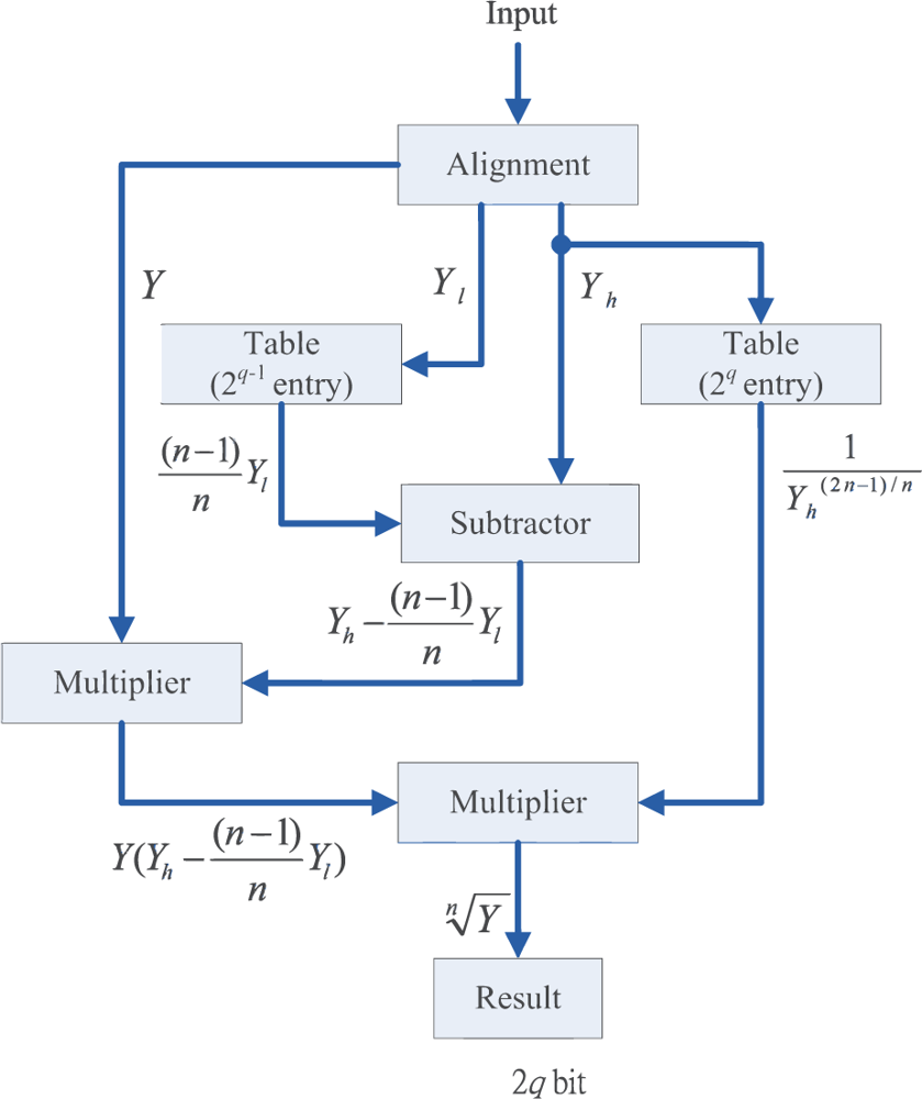 Observe from Equation (16) that the computation of Pk can be separated into c terms, where the j-th term involves the computation of (||xk − vj||)−2r/n. The basic circuit for calculating (||xk − vj||)−2r/n is shown in Figure 3(a). In addition to the n-th root circuit, it contains squared distance unit, r-th power unit and inverse operation unit. Both the squared distance unit and the r-th power circuit are based on multipliers. Similar to the n-th root circuit, the inverse operation circuit is also based on tables, multipliers and adders [14].