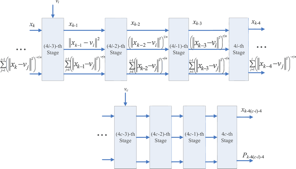 When xk enters the (4i − 1)-th stage, the accumulator at the 4i-th stage receives the sum of (||xk−4 − v1||2)−r/n, ..., (||xk−4 − vi−1||2)−r/n, from its precedent accumulator. It then adds the results of (||xk−4 − vi||2)−r/n to the sum, and then propagates the results to the subsequent stages. As the computation at the 4c-th stage for data point xk is completed, the output of the pre-computation unit is Pk.