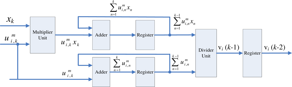 The membership coefficients updating unit receives the Pk value from the pre-computation unit, and then compute for i = 1, ..., c, concurrently. From Equations (12), (14) and (15), it follows that