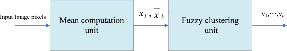 Figure 8 shows the architecture of FCM-S, which consists of two units: the mean computation unit and the fuzzy clustering unit. The goal of the mean computation unit is to evaluate the mean value x̄k defined in Equation (8). The main architecture of FCM-S is the fuzzy clustering unit, which computes the membership coefficients and centroids of FCM-S. Therefore, our discussion in this subsection will focus on the fuzzy clustering unit of the FCM-S. Using Equations (14) and (15), we can rewrite the membership coefficients of FCM-S defined in Equation (10) as