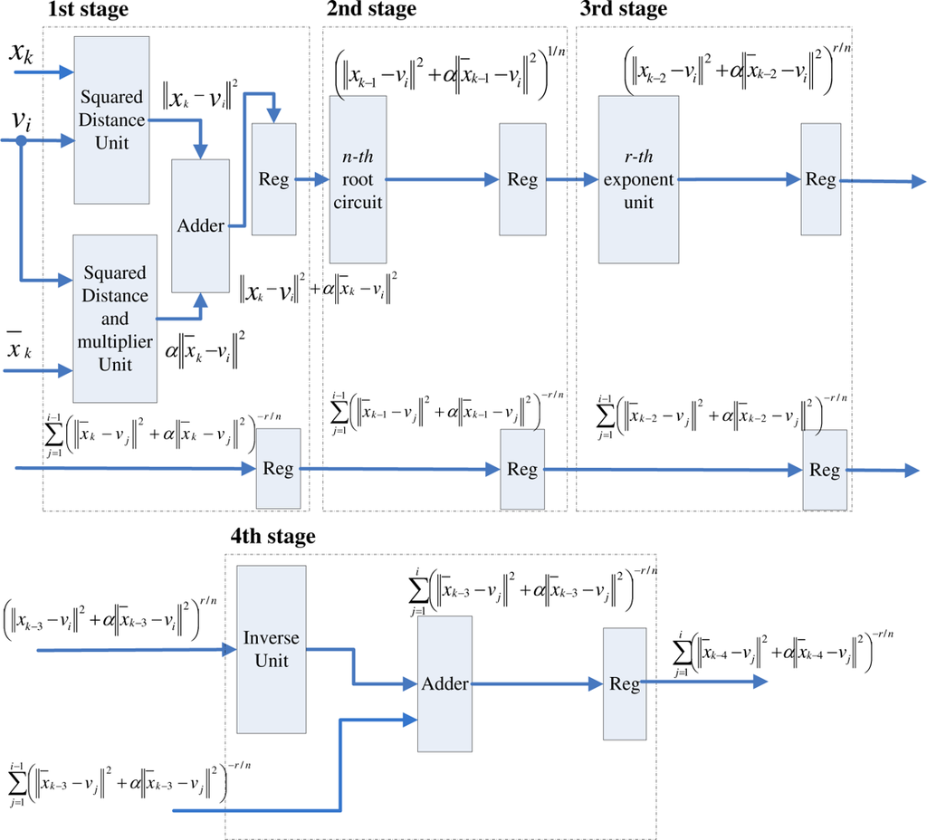 The basic circuit for calculating (||xk − vj||)−2r/n can be separated into a number of stages for pipeline implementation. Figure 3(b) shows an example for 4-stage pipeline implementation. It can be observed from the figure that two training vectors xk, xk−1, xk−2 and xk−3 are operated concurrently in the pipeline, where the first, second, third and fourth stages are used for computing ||xk − vj||2 and (||xk−1 − vj||2)1/n, (||xk−2 − vj||2)r/n, and (||xk−3 − vj||2)−r/n, respectively.