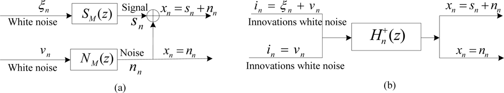 In the case of the application of additive noise alone, in becomes vn. From the fact that xn = HM(z)vn and , the relationship between minimum phase transfer function HM(z) and normalized minimum phase spectral factor is described as: