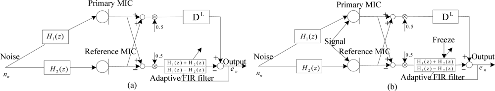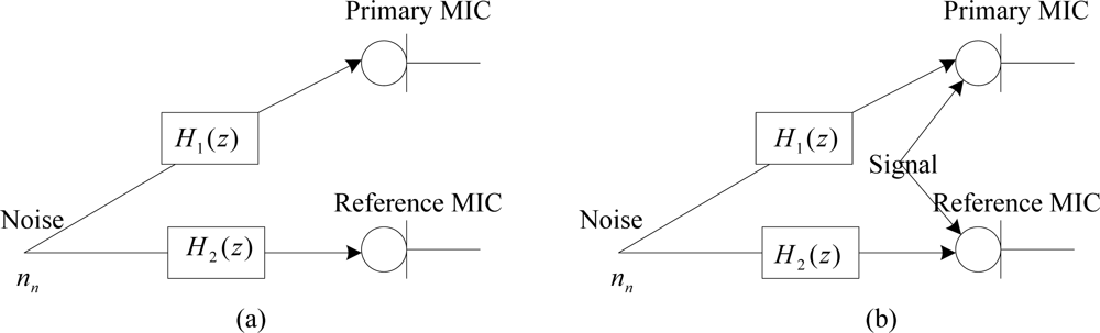 Since research on echo cancellation using adaptive filters and two-microphone sensors started in 1965, the adaptive filtering technique has been used as a solution tool for signal enhancing and noise cancelling schemes [1]. In 1975, Widrow et al. [2] proposed an FIR least mean square (LMS) algorithm-based ANC method using two microphones. This method requires that the primary microphone takes signal plus noise and the reference microphone takes noise alone, whereby the adaptive filter estimates noise statistics from the reference microphone and then uses them to minimize the output power in a minimizing mean square error (MMSE) calculation. From the theory, the application shows a practical problem due to the difficulty of separation between the period of the noise alone and the period of signal plus noise. This causes signal leakage into the reference microphone, which makes the adaptive filter estimate noise as well as the desired signal, hence results in limitations in the maximum cancellation from the output signal-to-noise ratio (SNR) with signal distortion.