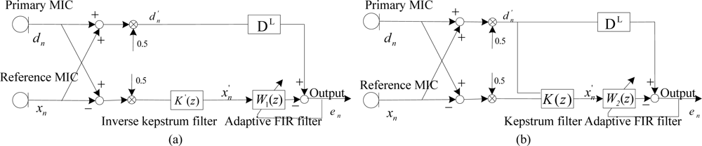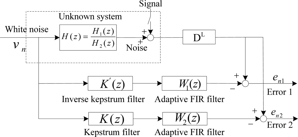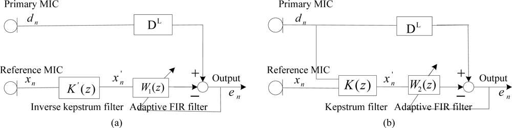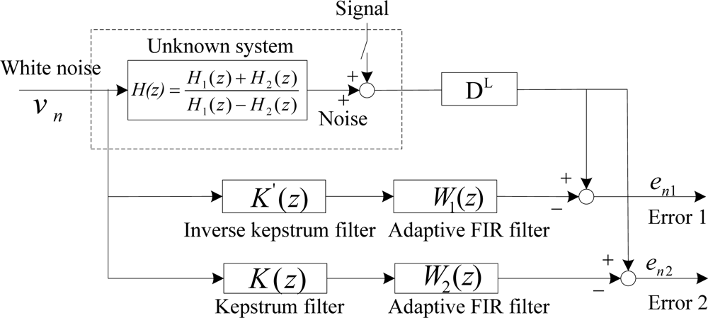 Assuming that each acoustic path transfer functions between two microphones and noise source are as given in (29), it is represented as the unknown system of (30). Its estimates are to be analyzed as shown in Figure 9, where the operation of the inverse kepstrum is to be compared with the kepstrum filter as a front-end application to the cascaded adaptive FIR filter.
