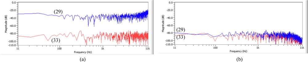 From the simulation test based on the block diagram (Figure 9) of the ANC structure [Figure 7(a)], it is found that the noise spectrum with nonminimum phase term in the polynomial denominator (33) shows worse and much different performance than one of nonminimum phase term in the numerator (29), as shown in Figure 13(a). On the other hand, from the simulation test based on the block diagram (Figure 12) of the beamforming structure [Figure 10(a)], spectra of both Equations (29) and (33) show good and almost same spectral performance, as shown in Figure 13(b). From the test result, it is shown that the adaptive FIR filter works well with the use of a small amount of weights and shows consistency in spectra in the beamforming structure for the noise with both nonminimum phase cases, Equations (29) and (33). On the other hand, based on the test result in Figure 13(a), a fluctuation in spectrum is expected in ANC structure in the case that noise statistics is frequently changed in a reverberant environment.