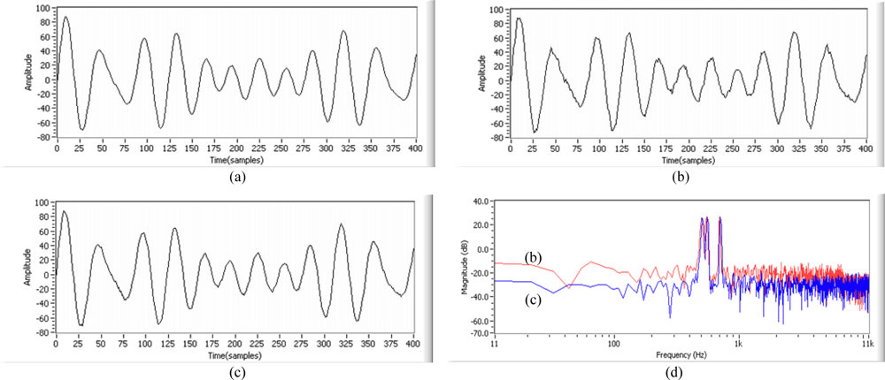 For the simulation test, the acoustic transfer functions of (29) are used as the unknown system, which has nonminimum phase component in noise. The desired signal, consisting of three frequencies (500 Hz, 550 Hz and 700 Hz), has arbitrarily been used as shown in Figure 14(a).