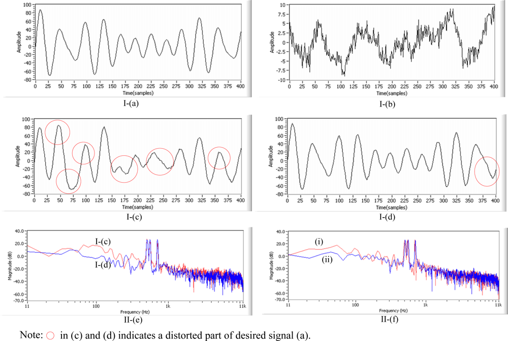 The simulation test results suggest that the inverse kepstrum should achieve more noise reduction without signal distortion in the desired signal by using small amount of adaptive FIR filter for the real tests in a realistic reverberant environment. Therefore, the inverse kepstrum has been tested in a beamforming structure [Figure 11 I-(a)] in a room. To verify the performance in signal, the desired signal [Figure 17 I-(a)] consisting of three frequencies (500 Hz, 550 Hz and 700 Hz) has been used, and music sounds tuned to a radio station [Figure 17 I-(b)] has been used as real nonstationary noise in a room. From the test on the ANC structure, it is shown that the shape of the signal waveform has been distorted in time domain, as shown in Figure 17 I-(c). On the other hand, it is shown that almost the same shape of the signal waveform has been maintained in the beamforming structure as shown in Figures 17 I-(d). The performance has also been compared in spectra in frequency domain as shown in Figure 17 II-(e). In the beamforming structure, the performance has been compared between 200 adaptive FIR filter weights alone [Figures 17 II-(f)-(i)] and 32 inverse kepstrum coefficients with 50 cascaded adaptive FIR filter weights [Figure 17 II-(f)-(ii)], where the test results show that inverse the application of the kepstrum with reduced adaptive FIR filter weights gives even better noise reduction performance while maintaining the original desired signal. It indicates that the application of the inverse kepstrum could provide a benefit of more computational simplicity than a kepstrum in processing as well as the ordinary adaptive FIR filter (Table 1). To reduce the computational complexity, the alternative method could be considered by decreasing the window size but the problem has been found with the widening sidelobe on the desired signal. By using the inverse kepstrum, it has been found that increasing to 4096 the window size is acceptable for the real-time processing with the narrowing sidelobe on the desired signal [21].