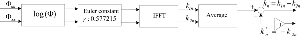 From (25), its logarithm needs to add Euler’s constant to be unbiased due to bias in magnitude [24]. Hence, each kepstrum coefficient from the two-microphone inputs are found from the inverse FFT (IFFT) of the unbiased logarithmic auto-periodograms and then by subtracting two kepstrum coefficient vectors (k1n − k2n), we can get the kepstrum coefficients (kn) for kepstrum processing. On the other hand, inverse kepstrum coefficients ( ) are found by negating the kepstrum coefficients (− k2n) from the reference microphone. The processing difference between inverse kepstrum method and kepstrum method can be found in Figure 4.
