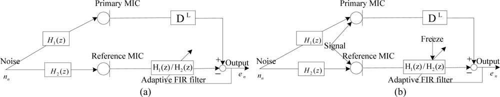 In the ANC structure, identification as an unknown system is represented as the ratio of acoustic transfer functions, H(z) = H1(z)/H2(z) as shown in Figure 7, where an ordinary adaptive FIR filter may be used to estimate the noise statistics during noise alone period. Its estimate is then applied to the signal and noise period to cancel the noise by using the estimated noise statistics with the condition that the desired signal should be only retained with no distortion.