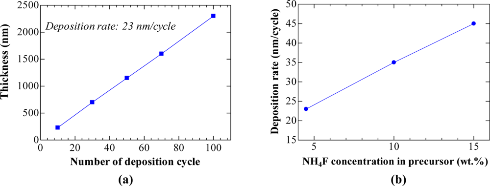 The variation of film thickness with the number of deposition cycles in Figure 1(a) reveals that this technique is superior to the conventional technique for improving the film thickness uniformity. The desired thickness could be easily adjusted since the film thickness is nearly linear with the number of deposition cycle. For the 4.5 wt.% NH4F precursor [Figure 1(a)], the deposition rate was ∼23 nm/cycle. When concentration increased to 10 wt.% and 15 wt.%, the deposition rate increased to ∼35 and ∼ 45 nm/cycle respectively, as shown in Figure 1(b). The increase in deposition rate with increasing the NH4F concentration has been found previously in NH4F/SnCl2 spray pyrolysis [18].