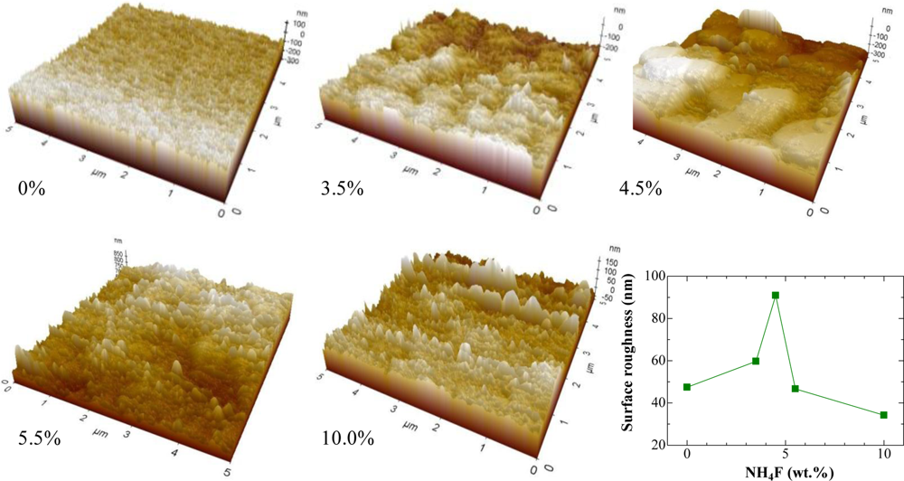 The peaks were broad, showing that the obtained films were small-sized nanocrystalline SnO2. The average crystalline size of SnO2 was estimated from XRD data using Scherrer’s equation [19] applied to the most intense 110, 101 and 200 diffraction lines. A broad size distribution ranging from 5.1 nm to 22.7 nm was found for the undoped film, however, the addition of NH4F into the precursor decreased the crystalline size and the size distribution became narrower (the calculated sizes were in the range of 3.7∼5.5 nm, 2.9∼3.9 nm and 2.7∼3.5 nm for 4.5 wt.%, 10 wt.% and 15 wt.%, respectively). Moreover, it was found that the crystalline size of films displayed very little dependence on the film thickness; the average size increased slightly from 4.3 nm for a 0.4 um-thick film to 5.0 nm for a 1.2 μm-thick film. Surface morphology of the films with different NH4F concentrations was examined by atomic force microscopy (AFM). The 3D images recorded at 5 μm × 5 m planar in contact mode are depicted in Figure 3.