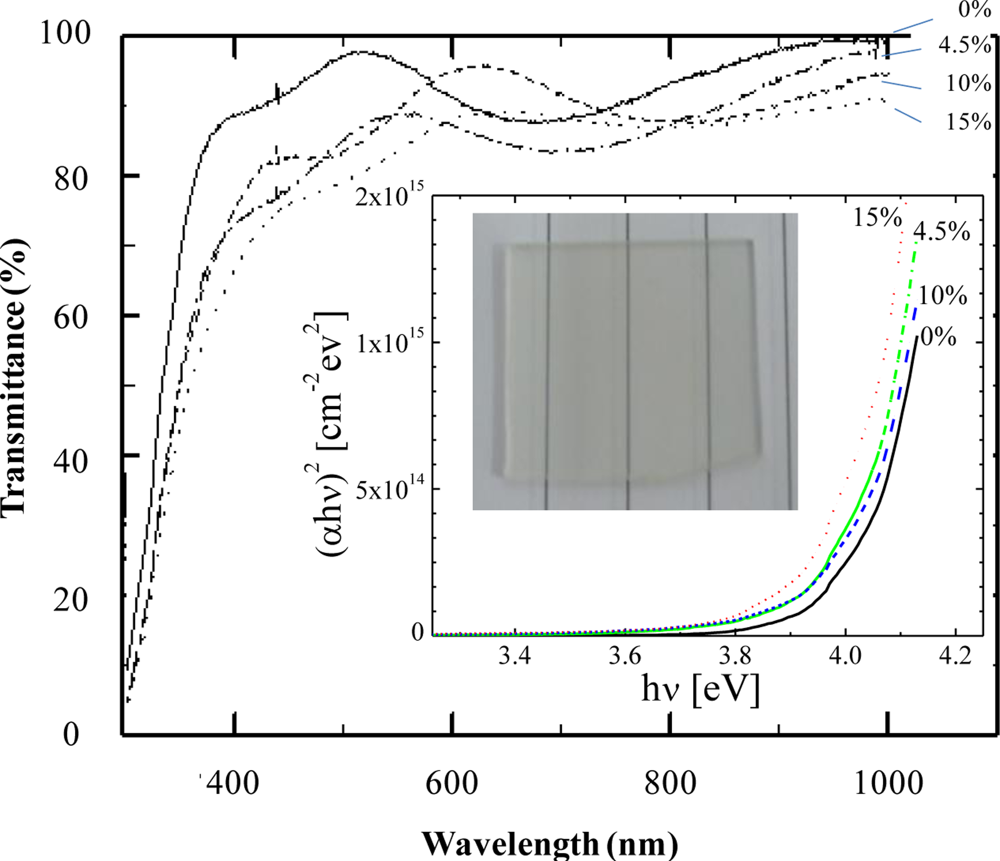 Root mean square (RMS) roughness of the films was obtained from the AFM data (inset in Figure 3). It was clearly seen that the oxide thin films deposited by dip-coating technique showed a nanoscale texture. AFM study reveals that the roughness of the films is dependent on the doping concentration. As shown in the figure, the surface roughness increased with increasing NH4F concentration and reached a maximum of 90 nm at 4.5 wt.%. However, it decreased with further increases in concentration (>4.5 wt.%). The change in the surface roughness with varying NH4F concentration may be due to the deep/shadow distribution of fluorine atoms in the tin oxide structure [20] and also the vaporization of fluorine from the films during the annealing process [21]. Figure 4 shows the wavelength dependence on optical transmittance of SnO2:F thin films deposited with various NH4F concentrations. The transmittance of all samples was more than 70% in the whole visible-light region (i.e., above 400 nm). The optical energy band gap (Eg) calculated from the optical transmission [22] was in the range of 3.95∼4.05 eV, and was found to slightly decrease for higher NH4F dopant (inset in Figure 4). The obtained Eg in this work was higher than those reported in previous works [23,24]. This could be due to the small grain size effect of the films [25].