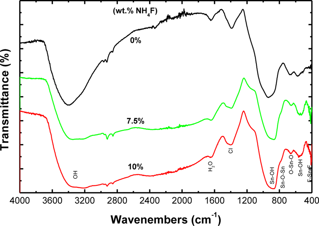 The vibration frequencies of SnO2 were found to shift for the doped films. This shift can be ascribed to the increase in lattice disorder due to the in the lattice [29]. Moreover, it is interesting to note that an addition peak near 410 cm−1 was observed for the films doped with NH4F but absent for the un-doped SnO2 sample. This peak could be distributed to vibration frequency of F-Sn-F [29,30]. The FTIR spectra obtained in this work were comparatively broader in comparison with previous works [26,31]. This may be due to nanocrystalline nature of our films [28]. Auger electron spectroscopy (AES) analysis of the F-doped films was also carried out in order to determine the doping level of fluorine in the films (data not shown). It was found that no fluorine was detected for all studied films i.e., the concentration of the fluorine incorporated on the films in this case was less than 0.1% which is the detection limit of the analytical method. The low concentration of fluorine in the films could be due to the vaporization of fluorine from the films during the annealing-cycle process [21].
