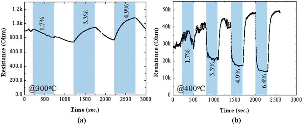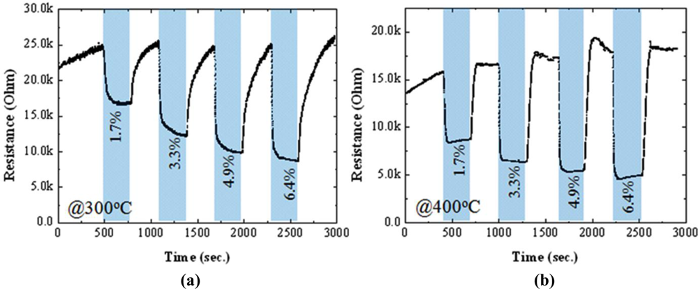 A strong influence of F-doping on the gas sensitivity of SnO2 thin films could be found in Figures 6 and 7. At a high operating temperature (400 °C), the resistance of the un-doped sensor decreased in the presence of LPG and recovered to its baseline resistance after switching to N2, showing an n-type-like response to LPG [Figure 6(b)]. This is understandable because SnO2 sensors are known to behave as an n-type semiconductor. However, completely opposite behavior was observed for gas sensing at a low operating temperature (300 °C); the resistance of the sensor increased upon exposure to LPG, showing an p-type-like response, as displayed in Figure 6(a). It should be noted here that the transition between n-type and p-type responses could be reproducible under N2 atmosphere by changing the operating temperature. The p-type-like response to LPG was found in all un-doped SnO2 sensors only when the operating temperatures was lower than 300 °C, regardless of the film thickness (studied range: 250∼500 nm). The transition from n-type to p-type response and vice versa has been reported previously in some un-doped materials, such as In2O3 [34] and Fe2O3 [35]. The observed phenomena may be related to the small crystallite size of SnO2, which promotes the adsorption of catalytic water vapour [34] and/or band-bending-induced oxygen [35] at the surface of SnO2. In contrast to the un-doped sensors, F-doped sensors (Figure 7; for 4.5 wt.% of NH4F) showed n-type-like response, regardless of the operating temperature (studied range: 250–400 °C). As shown in Figures 6 and 7, the response of the sensors deposited both with and without F dopant increased with increasing the operating temperature. However, at a low temperature of 300 °C, F-doped sensors hold reasonably good response with high stability to LPG, compared to the un-doped one. Therefore, the temperature at 300 °C was taken as an operating temperature for further studies.