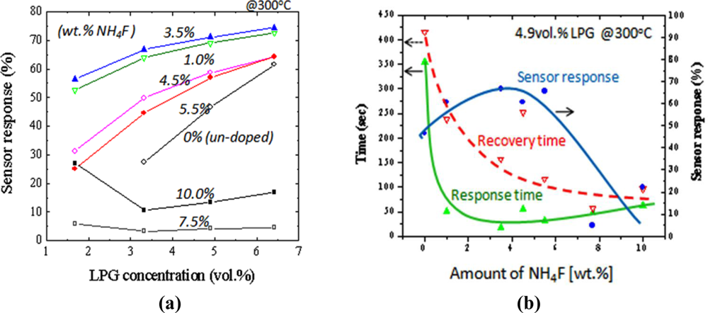 Figure 8(a) summarizes the results of sensor response at 300 °C to N2-diluted LPG (1.7∼6.4 vol.%) for the sensors prepared under different amount of NH4F. As can be seen for this result, the enhancement in sensor response to LPG could be achieved by adding F-dopant into the SnO2 materials. The response increased with an increase in NH4F concentration. The maximum response was obtained at 3.5 wt.% of NH4F. However, a decrease in response was observed when the NH4F in the precursor was more than 5.5 wt.%. It is well known that the sensor response of the sensor increases with increasing roughness of the film, because of the increase in the number of the active adsorption sites for oxygen or hydrocarbon molecules on the sensor surfaces [36]. This could explain the maximum response of the sensor doped at 3.5 wt.% of HN4F. Figure 8(b) shows the sensor response time, recovery time and sensor response as a function of NH4F concentration. The sensors were tested under 4.9 vol.% of LPG at 300 °C. It was shown that not only the response magnitude, but the response speeds were also enhanced by increasing the NH4F concentration. Compared to the un-doped sensors, the response and the recovery time (0–90% of final value) of the doped sensors decreased 7 times (from ∼350 to ∼50 s) and 2.5 times (from ∼400 to ∼150 s), respectively. The enhancement of the sensing properties observed for the F-doped films could be due to the decrease in grain size and the increase in surface roughness in the resulting metal oxide films.