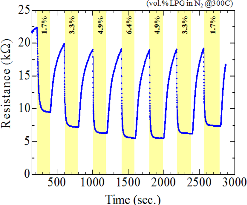 A SnO2 thin film sensor with finger interdigital electrodes was mounted tightly on a heater in a homemade test chamber whose temperature could be measured and controlled by a thermocouple. The sensing characteristic was examined by monitoring the changes in resistance, with a constant voltage of 1 V using Keithley source meter (model 2004). The sensor response to LPG was defined as |Ra − Rg| × 100/Ra, where Rg is the sensor resistance in the presence of LPG and Ra is that of baseline in N2 (or zero air) (TIG, Thailand; Industrial grade). The sensor response to 0.1∼6.4 vol.% of LPG was measured at 250∼400 °C. Commercially available LPG (PTT, Thailand) was used for this measurement. Varying LPG concentration was achieved by using a mass flow controller unit. The gas pressure over the sensor was 1 atm during the experiments. Data acquisition, storage and plotting in real time were realized using a personal computer with LabVIEW® software via a GPIB interface control.