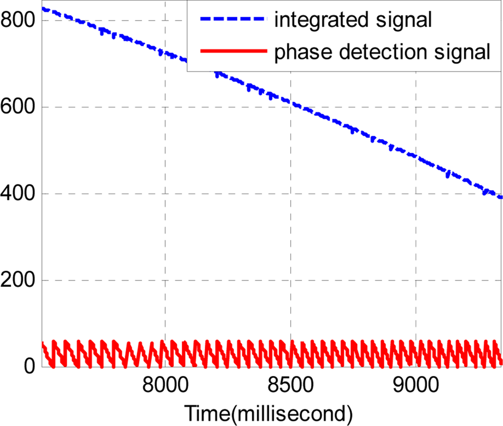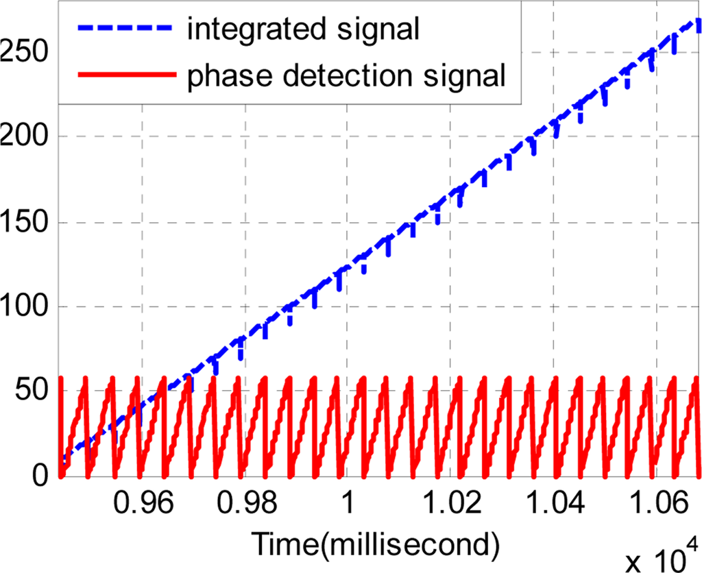 The frequency spectrum of the position signal must be within the track-differentiator’s frequency band, so the high-frequency noise can be filtered. Considering the relation of phase and alveolar counting, it can be easily found that the phase is a subdivision of alveolar counting. The phase signal can be treated as the low bit while the alveolar counting is the high bit, so the saw-tooth wave is turned into a ramp wave. Then they can be integrated as follows: