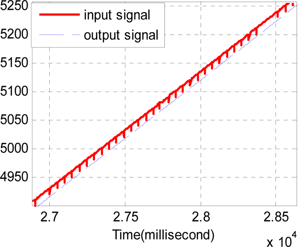 From comparison of the input curve and the following curve in Figure 12, the filtering results in the time delay just as the analysis of Section 3.3. Even though the filter produces a nice smooth effect, the output signal cannot be used because of the time delay.