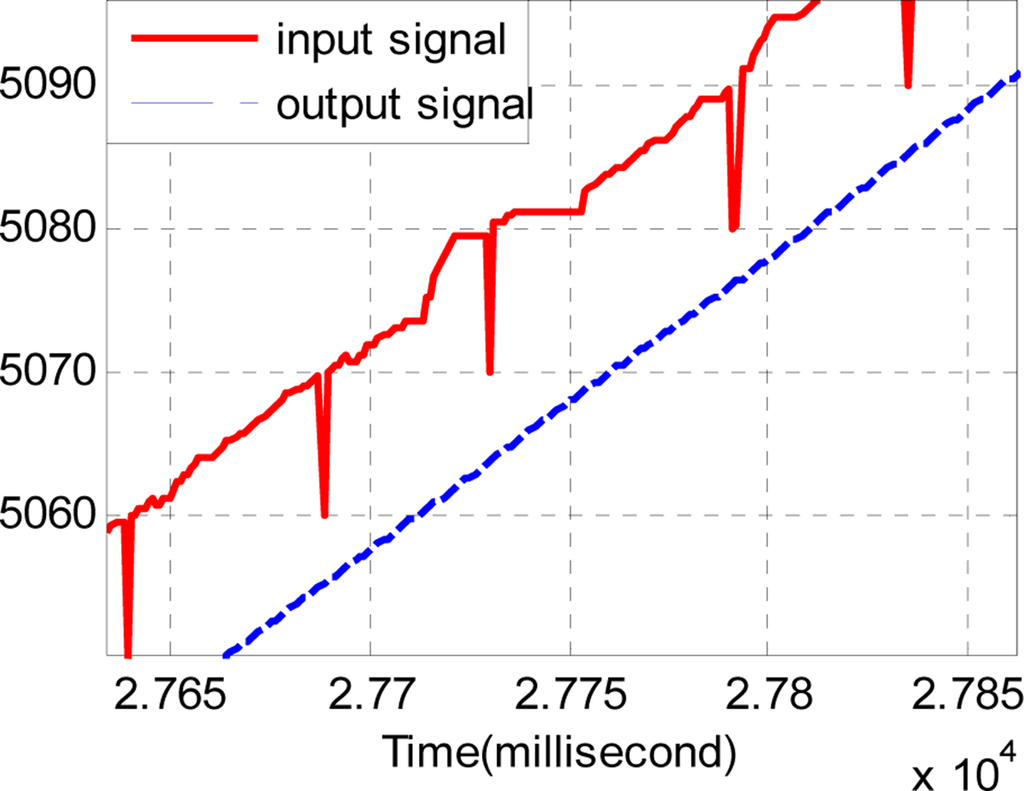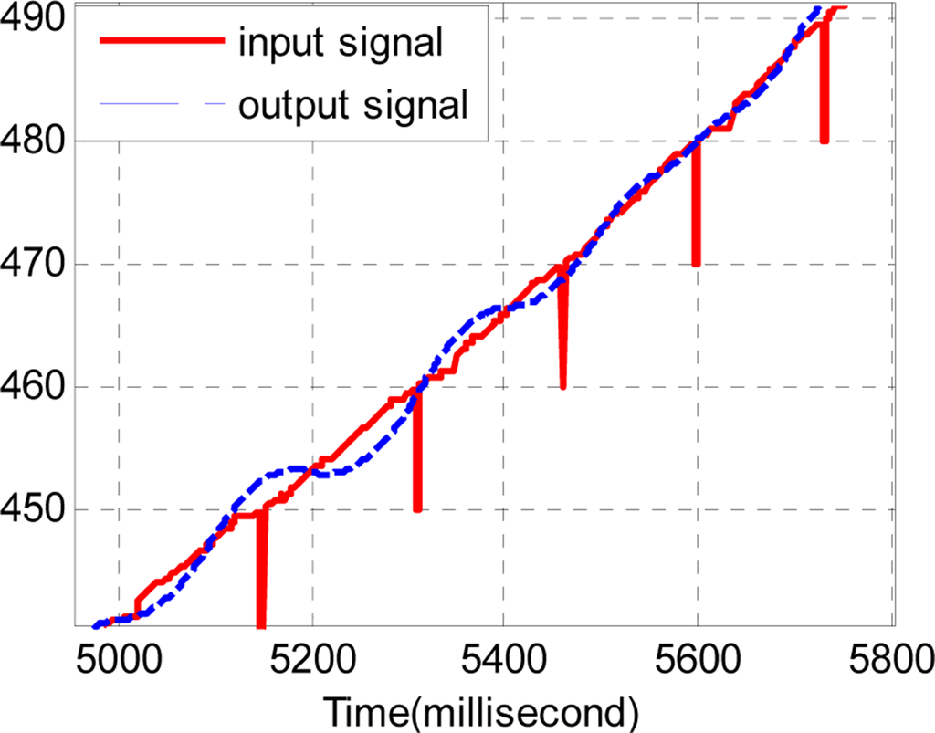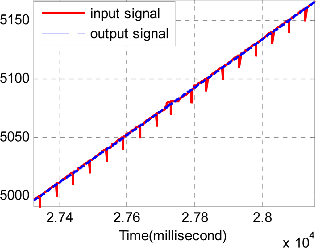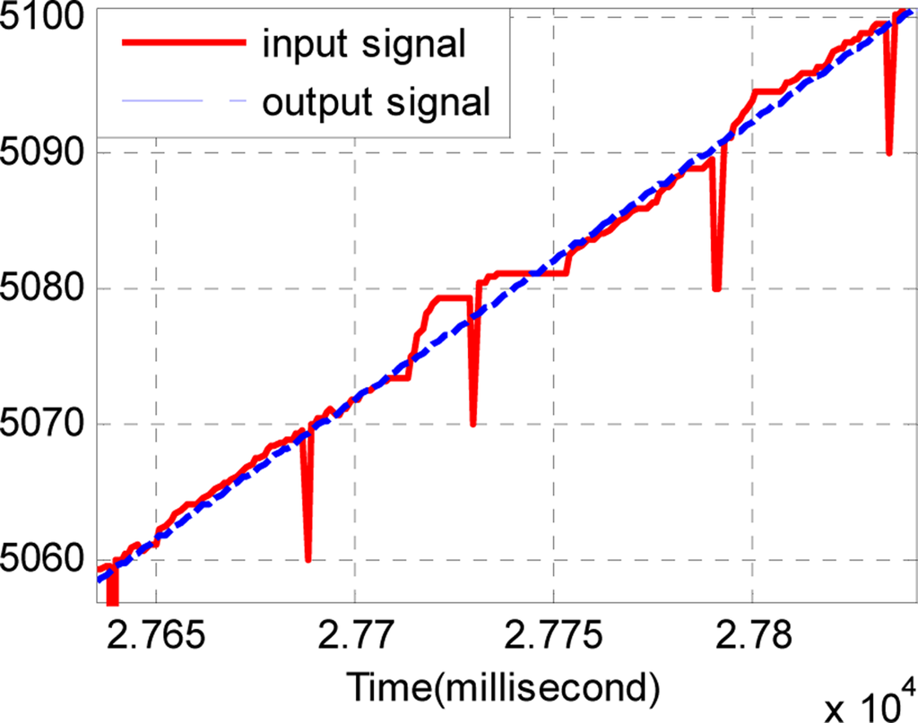 The sample period of the discrete track-differentiator is one millisecond, and the quickness factor r is 1,500. Figures 11 and 12 show the comparison of the input signal and the output signal. It can be seen that the track-differentiator can effectively smooth the input signal and remove the impulse interference.