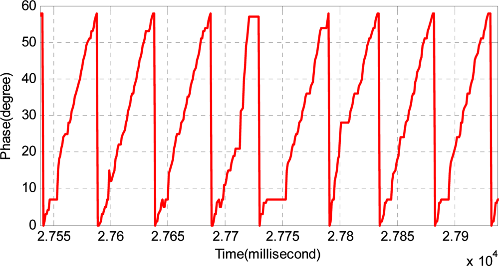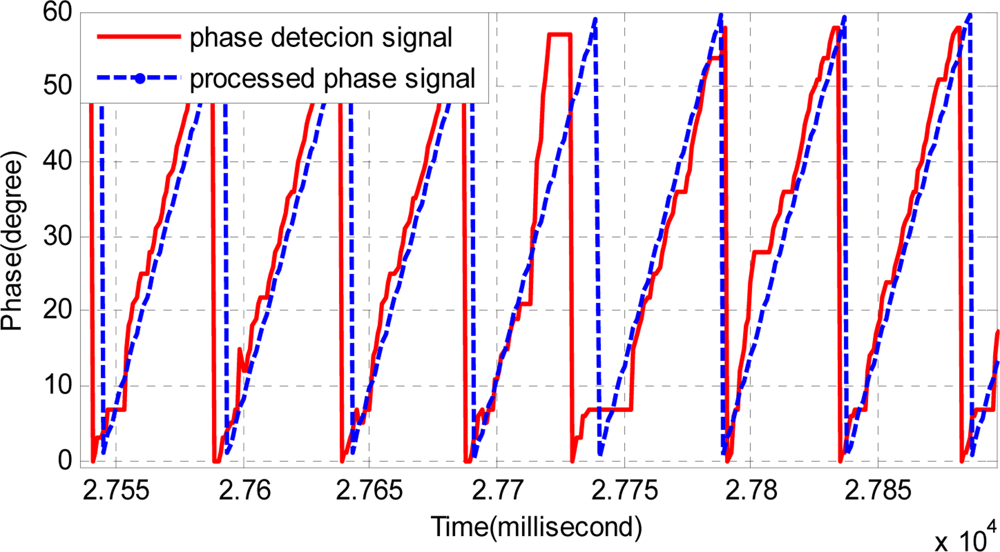 In theory, the signal of phase detection increases or decreases in terms of the train’s running direction between zero degrees to sixty degrees. In the forward running condition, as the phase detection signal changes from sixty degrees to zero, the alveolar counting signal increases by one. In the backward condition, as the phase detection signal changes from zero degree to sixty, the alveolar counting signal decreases by one. But in the real circuit processing, the sine wave obtained by synchronous demodulation is sent to a different post-processing circuit, and then the change of phase signal and alveolar counting signal are not synchronized. If the signal processing unit simply integrates them, there will be a mutation as shown in Figure 6. The amplitude is about sixty degrees.