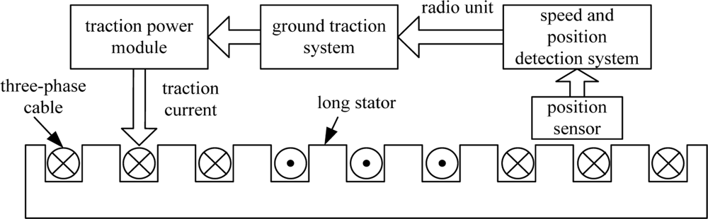 A permanent magnet electrodynamic suspension (EDS) train uses a linear motion actuator to achieve traction [1]. Its current transformer is placed on the ground. The long (primary) stators of the linear synchronous motor are laid on the middle of the tracks. The permanent magnet for traction is installed at the bottom of the vehicle which faces the long stators. This is shown in Figure 1. This kind of traction mode has high power factor and high efficiency the characteristics, allowing it to attain high acceleration and speed. The coils of the long stators can produce a travelling wave magnetic field. To make the traveling magnetic field synchronize with the magnetic field produced by the permanent magnet, the traction system needs to detect the position of the secondary, only so the current can be modulated to control the output force. Then the detection of the secondary position is extremely important. The error detection will not only make the vehicle run abnormally, but also cause serious damage to the correlated equipments [2–4].