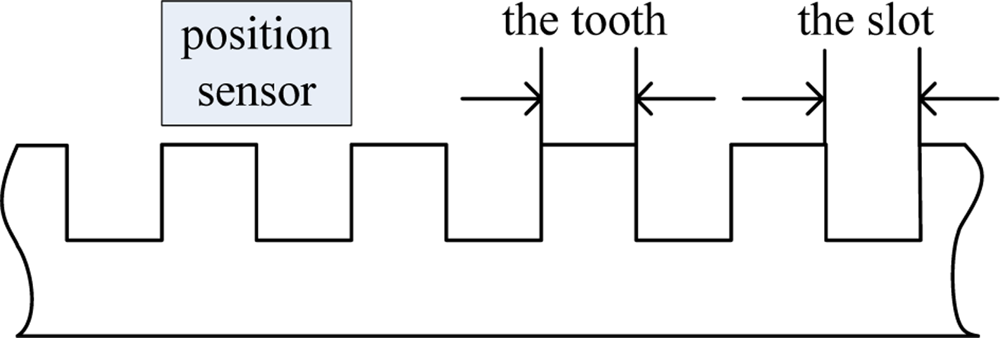 The position sensor’s detection object is the long stator which is used as the train’s traction. The long stator is composed of silicon steel sheets. It has the alveolar structure shown in Figure 3. The detection coils of the sensor face the alveolar structure. When a sensor moves along the long stators, it can distinguish the teeth and the slots. By counting the passed alveolar structure, the train’s position is detected [8,9]. Generally, the position sensor has the three functions: