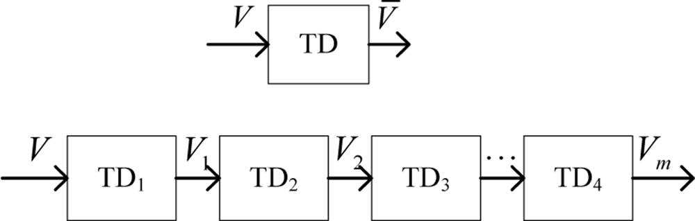As far as the single track-differentiator, the output signal V̄ is a kind of function on the filtering factor c0, damping factor c1, quickness factor r and time-delay factor τ. The output signal of track-differentiator has a time delay. The solution is to modulate the correlated parameters, but tracking errors will then increase. The track-differentiator group is a kind of method to relieve the contradiction error and time delay. It is shown as Figure 5. The track-differentiator filter is called TD for short.