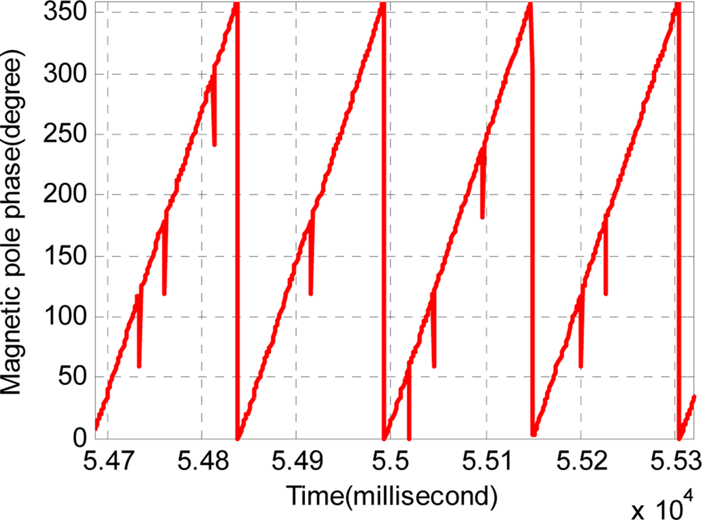 Magnetic pole phase (zero degree to three hundred and sixty degrees): The magnetic pole phase signal of is used for the traction, where every sixty degrees represents one alveolar structure. It is calculated by the alveolar counting signal and phase detection.