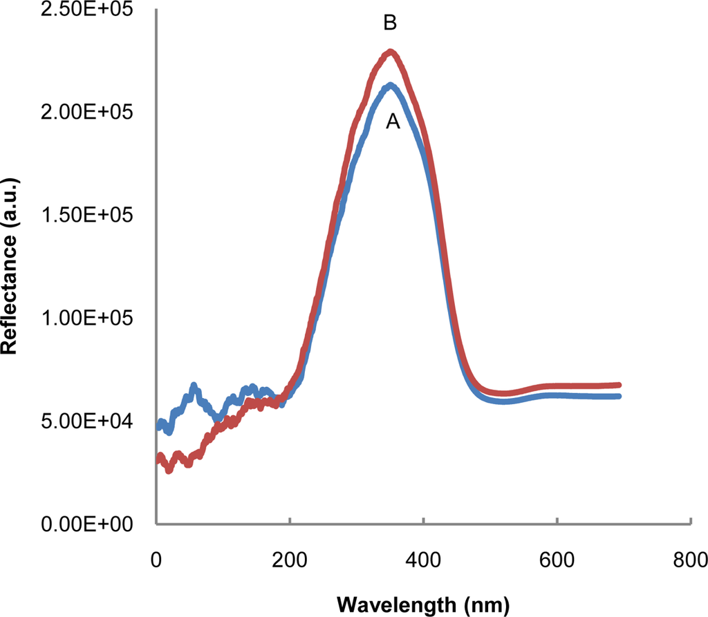 Figure 1 shows the reflectance spectra before (A) and after (B) introducing the test trip into100 ppm of benzoic acid solution.