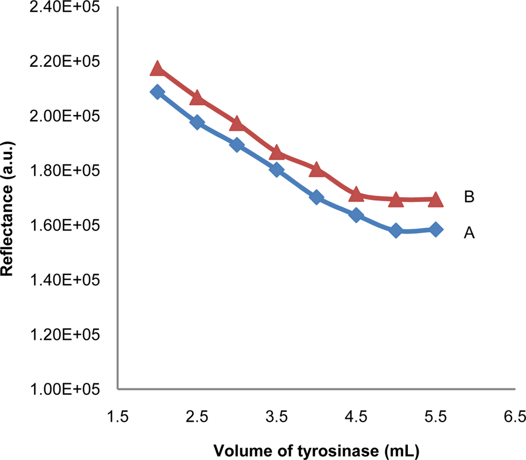 The effect of amount of tyrosinase immobilized on the test strip was also studied and the result is shown in Figure 3. The intensity of reflectance decreases with the increase in tyrosinase volume until a constant value is reached for both with and without benzoic acid. Increase in tyrosinase volume leads to the increase of the enzyme-substrate complex formed [17] and the intensity of the maroon color of the test strips. This plateau region is reached when all available tyrosinase has been converted to enzyme-substrate complex. Based on this observation, volume of 3.5 mL was chosen for the fabrication of further test strips.