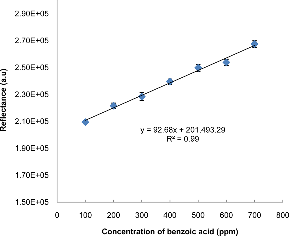 The prepared test strips were introduced into 5 mL of benzoic acid solution (100 ppm) for 30 min. The change in color was measured using an optical fiber reflectance spectrophotometer. Reflectance was recorded between 300 to 600 nm of wavelength.