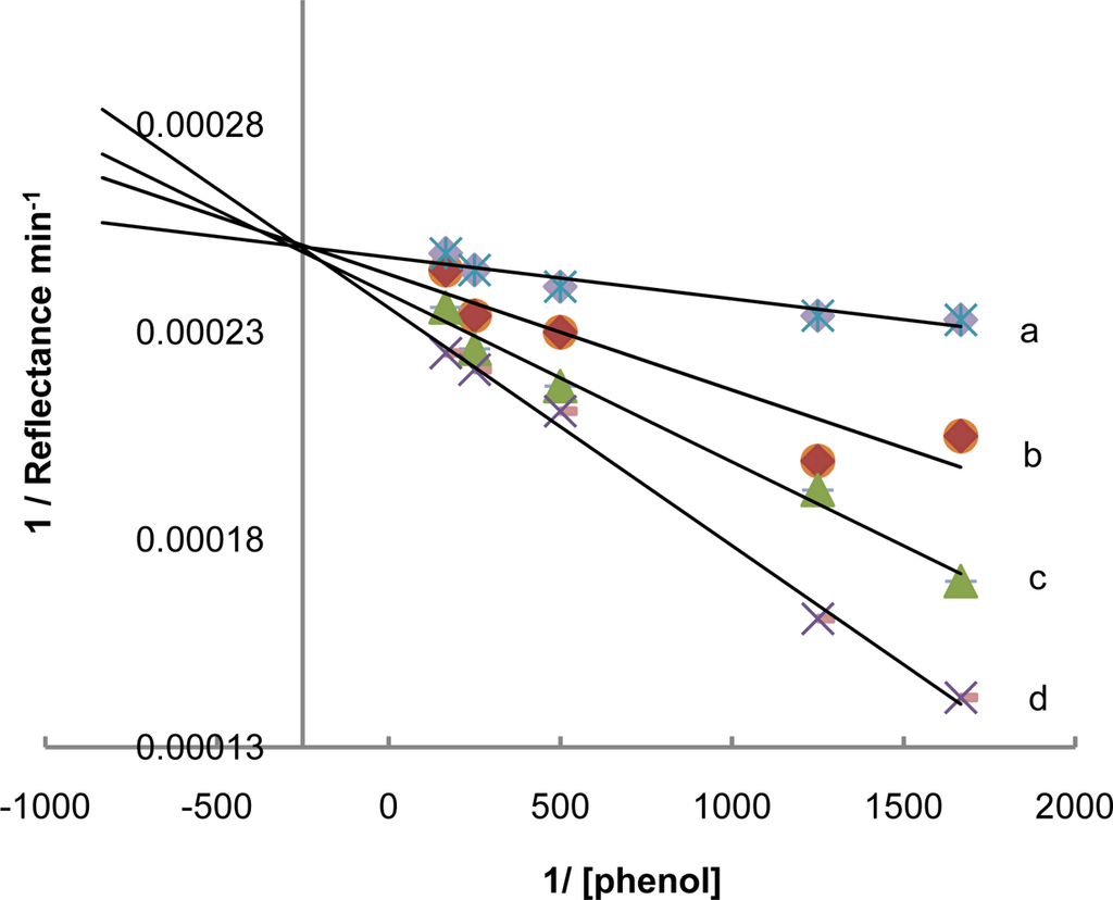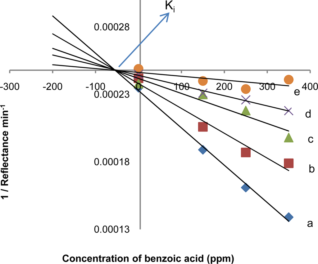 The inhibition mechanism can be studied by examining the relationship between the response of the sensor to the substrate and the inhibitor concentration [18]. In this study, the inhibition kinetics of tyrosinase by benzoic acid was investigated. The relationship of enzyme activity in the absence and presence of different concentrations of benzoic acid was interpreted using the double-reciprocal Lineweaver-Burk plots. Figure 5 shows the plots of 1/reflectance min−1 versus 1/[phenol] that gives a straight lines with different slopes intersecting one another in the Y axis. Higher concentration of benzoic acid resulted in an increase in the slope value, indicating that inhibition of benzoic acid on the enzyme is a reversible reaction.