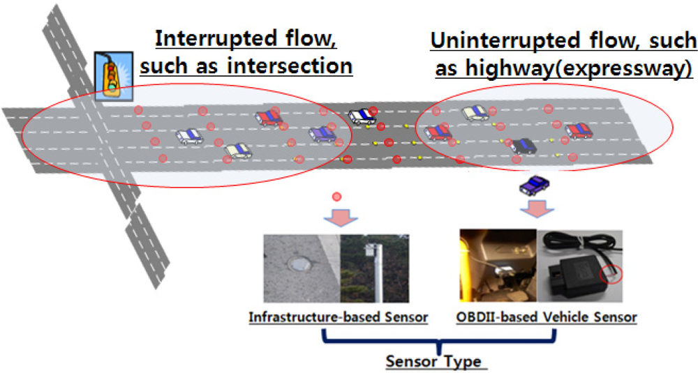 The goals of ITS strategies are reducing travel time, easing delays and congestion, improving safety, and reducing pollutant emissions without the need for new roadway construction. ITS strategies that contain electronic surveillance, communications, and traffic analysis and control technologies bring about benefits to transportation system users and managers. ITS sensors often serve as data-gathering elements of an ITS, and therefore dictate ITS operating characteristics, types of data provided, and installation requirements. In particular, ITS and Telematics departments have gradually increased their interest in vehicle data through access to industry-standardized in-vehicle interfaces. This attempt to gather vehicular information and access can be determined differently depending on the type of roadway and collecting sensors used in the service. As shown in Figure 1, roadway types are classified into two categories of flow: uninterrupted and interrupted. Uninterrupted flow facilities have no fixed elements, such as traffic signals, that are external to the traffic stream and may interrupt the traffic flow. Traffic flow conditions result from interactions among vehicles in a traffic stream, and between vehicles and the geometric and environmental characteristics of the roadway. Interrupted flow facilities have fixed elements, such as traffic signals, stop and yield signs, and other types of controls, which may interrupt traffic flow. To capture vehicle movement in real-time, a road sensor is required at each type of facility. There are two popular categories of sensors: infrastructure-based sensors and OBDII-based vehicle sensors. Infrastructure-based sensors include pressure detectors, inductive loop detectors, magnetic detectors, ultrasonic detectors, microwave detectors, infrared detectors, and image detectors. These types of sensors utilize a part of the signal control and traffic operation in an ITS. In contrast, vehicle sensors include GPS, automatic vehicle identification (AVI) using radio frequency identification (RFID) tags, and on-board diagnostics II (OBD)-based vehicle sensors, which are connected to an in-vehicle network.