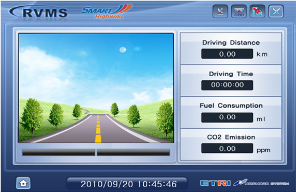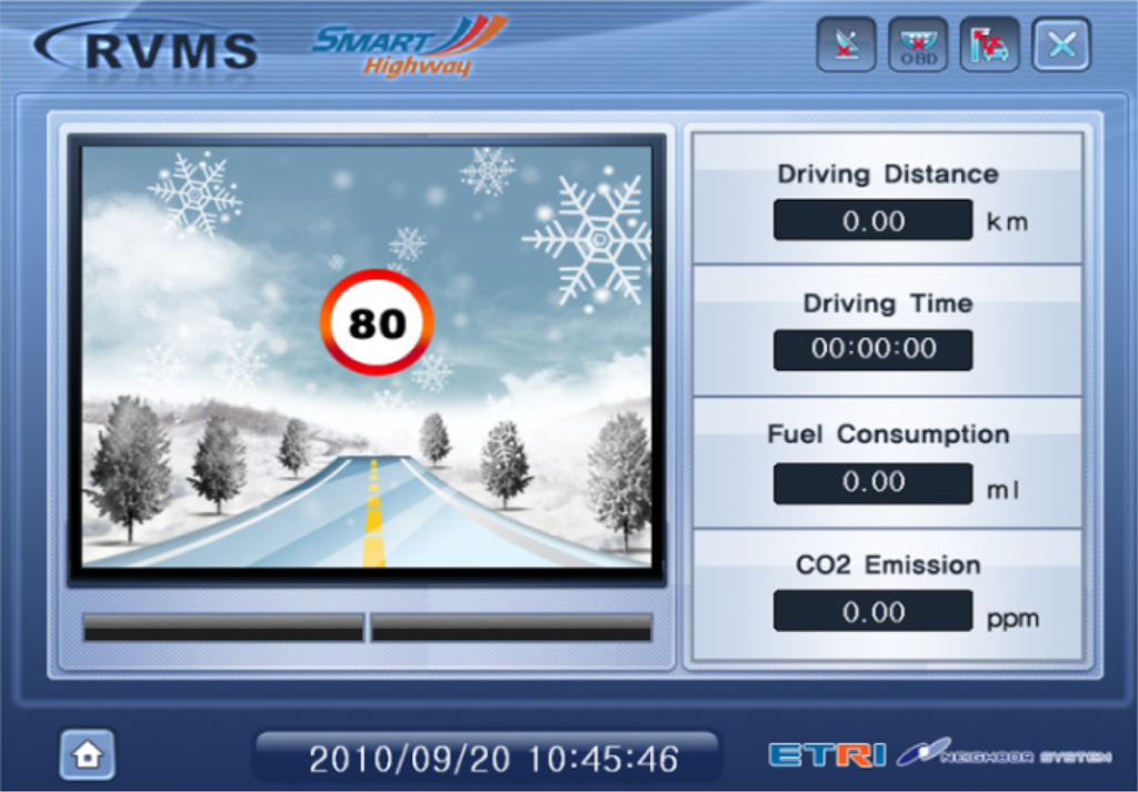 As the results of the algorithm are advisory safety speeds for drivers, advisory safety information should be provided to in-vehicle Telematics devices using I2V. Figures 10 and 11 show examples of a GUI used in a Telematics terminal. As shown in Figure 11, the ‘80’ in the left-circle indicates the optimal advisory speed for road surface data such as ice, under the current traffic condition. This GUI displays the results from the developed Telematics device, and shows the total driving distance, total driving time, amount of fuel consumption, and CO2 emissions of the vehicle via an OBDII interface from an ECU. This device is very useful for driver assistance. In recent research, providing road surface warning signs has shown to be effective in reducing accident frequency and severity. Also, speed is not only related to the risk of being involved in a crash in the first place, but also affects the severity of a crash when one occurs. This processing method from a smart roadside server can be used as a new service model for uninterrupted roads that have implemented new information and communications technologies such as an Intelligent Vehicle Highway System (IVHS).