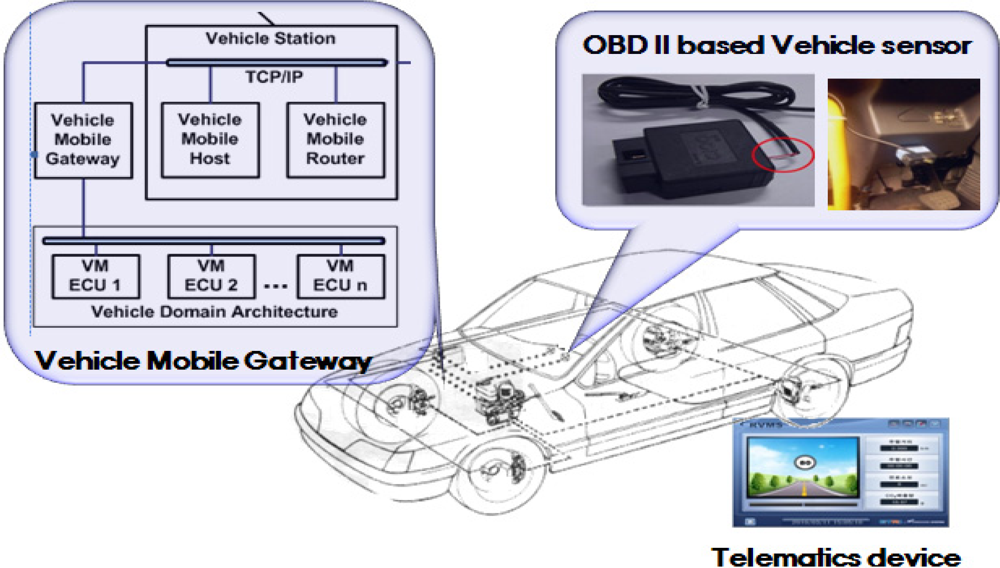 As shown in Figure 3, an OBD II-based vehicle sensor is connected to the vehicle domain architecture designed by the vehicle manufacturer via a any gateway. The gateway is an interface device placed in a vehicle that acts as a mobile gateway between the vehicle's engine control unit (ECU) and an external device [ISO/DTR 13185-1.3].